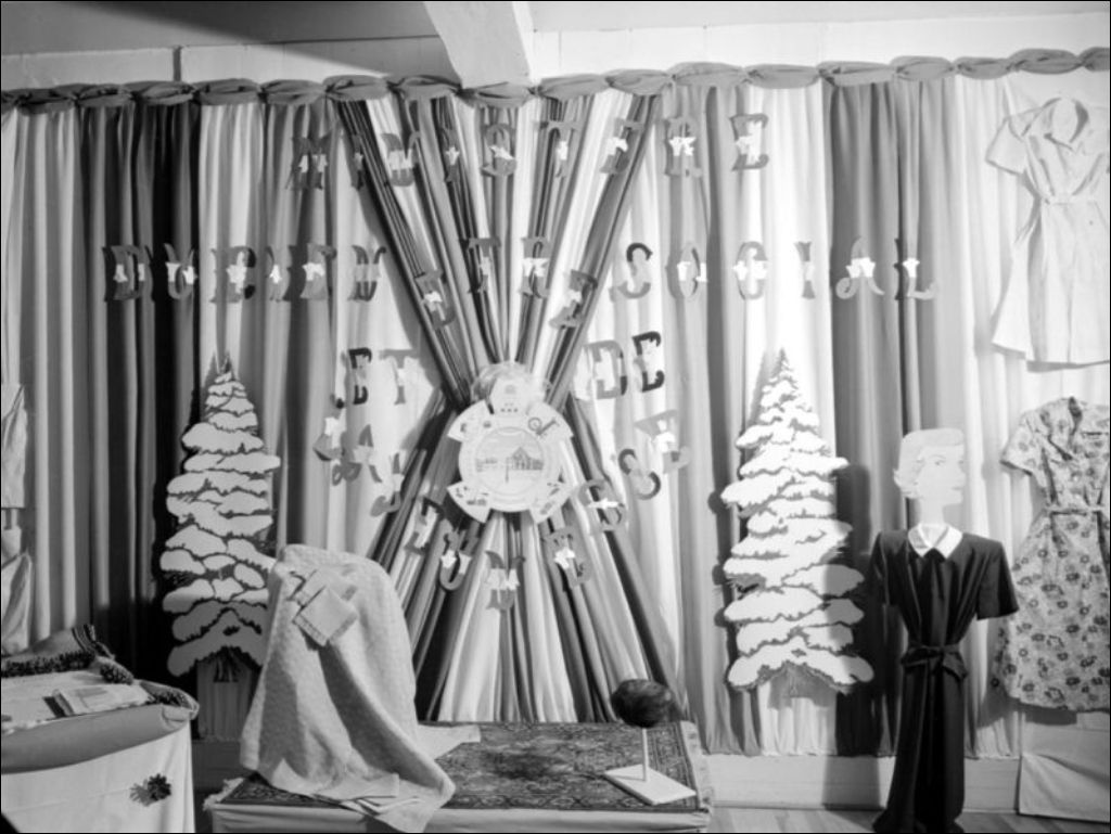 Il s'agit d'une exposition des travaux d'élèves de l'École ménagère d'Upton. Nous remarquons l'espace réservé à la promotion du ministère du Bien-être social et de la Jeunesse (E6,S7,SS1,P55389); des broderies (E6,S7,SS1,P55390); des chapeaux, robes et sous-vêtements (E6,S7,SS1,P55393 et E6,S7,SS1,P55395); des gants et bas (E6,S7,SS1,P55396); des jupes, sacs à main et écharpes (E6,S7,SS1,P55397). Nous remarquons également des visiteurs s'attardant à la table sur laquelle sont exposées des créations culinaires (E6,S7,SS1,P55399); les élèves de l'école (E6,S7,SS1,P55400); la directrice, Madame Morier, entourée d'èlèves au pied d'un arbre de Noël (E6,S7,SS1,P55401). Les scènes ont été photographiées pour le Service d'aide à la jeunesse du ministère du Bien-être social et de la Jeunesse