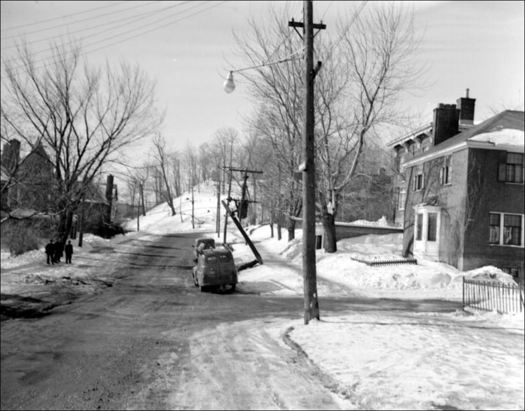 - Il s'agit d'un poteau électrique d'une rue résidentielle endommagé par un camion. Nous remarquons le poteau brisé; le transformateur suspendu; les traces des pneus du camion sur la glace (E6,S7,SS1,P55589). Les scènes ont été photographiées pour Hydro-Québec