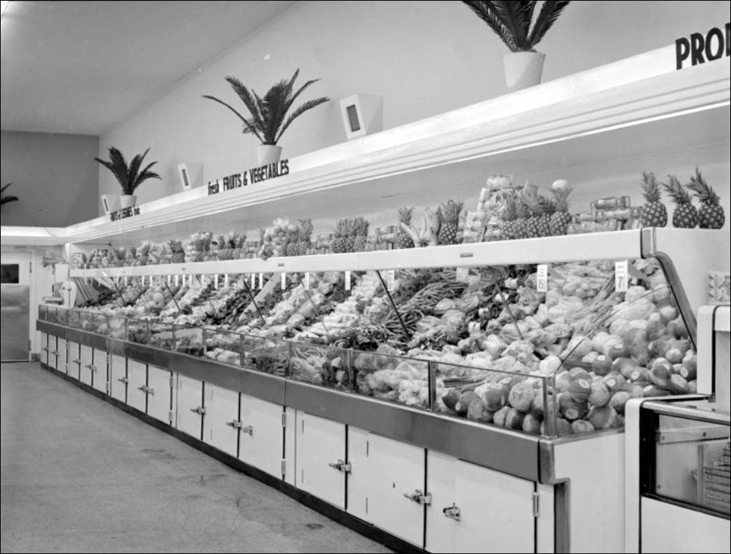 - Vues des étalages de fruits et de légumes dans un supermarché. Nous apercevons le marchand (E6,S7,SS1,P56163) et les clients (E6,S7,SS1,P56165) dans l'épicerie (E6,S7,SS1,P56156, E6,S7,SS1,P56158, E6,S7,SS1,P56161, E6,S7,SS1,P56162 et E6,S7,SS1,P56168). Reportage produit pour le Service de l'horticulture, ministère de l'Agriculture