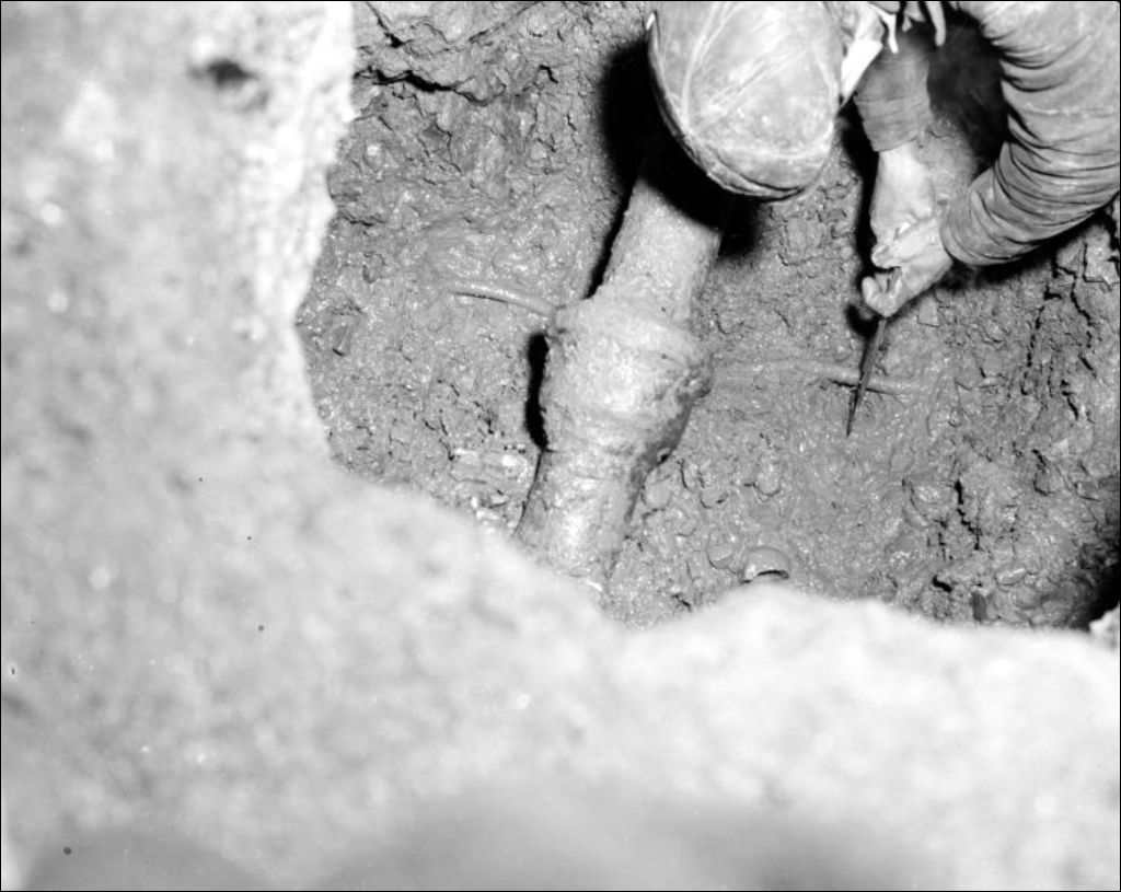 - Il s'agit d'une canalisation brisée près d'un poteau d'Hydro-Québec. Nous remarquons une porte cochère (E6,S7,SS1,P58294 et E6,S7,SS1,P58295). Dossier produit pour Hydro-Québec