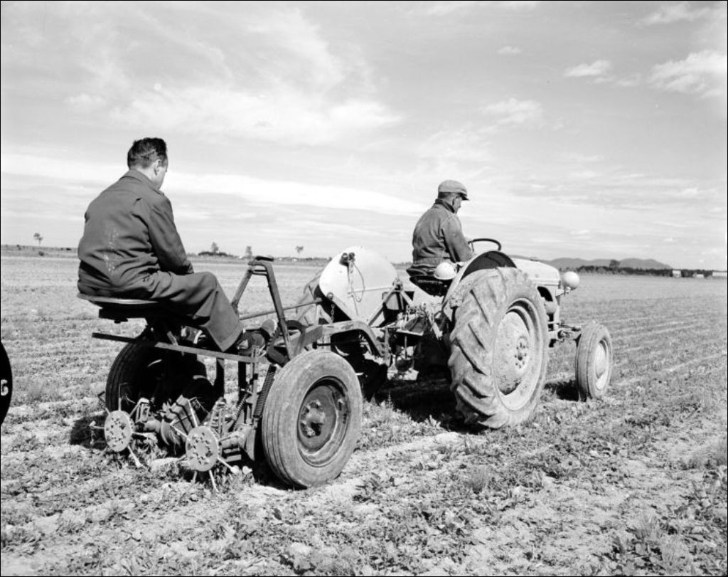 - Il s'agit probablement d'une comparaison entre l'ensemencement manuel et mécanique. Nous remarquons un tracteur (E6,S7,SS1,P59331a). Dossier produit pour Paul Boucher