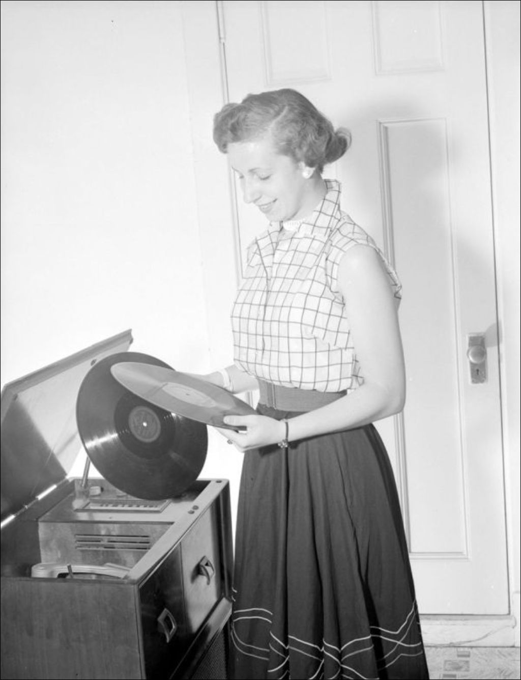 Une femme tient dans ses mains un disque de la compagnie RCA Victor (E6,S7,SS1,P59380); d'autres cousent (E6,S7,SS1,P59381). Dossier produit pour R. Martin