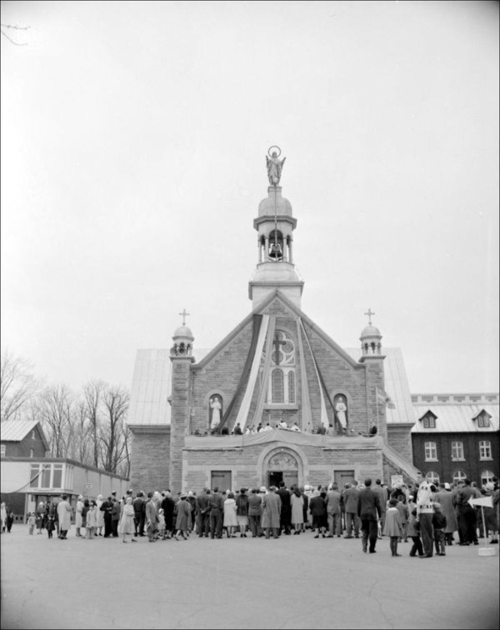 - À Pointe-aux-Trembles, des fidèles sont rassemblés devant l'église. On aperçoit les voitures stationnées à proximité. Un des clichés montre l'officiant. Événement photographié pour M. Dallaire du ministère des Transports