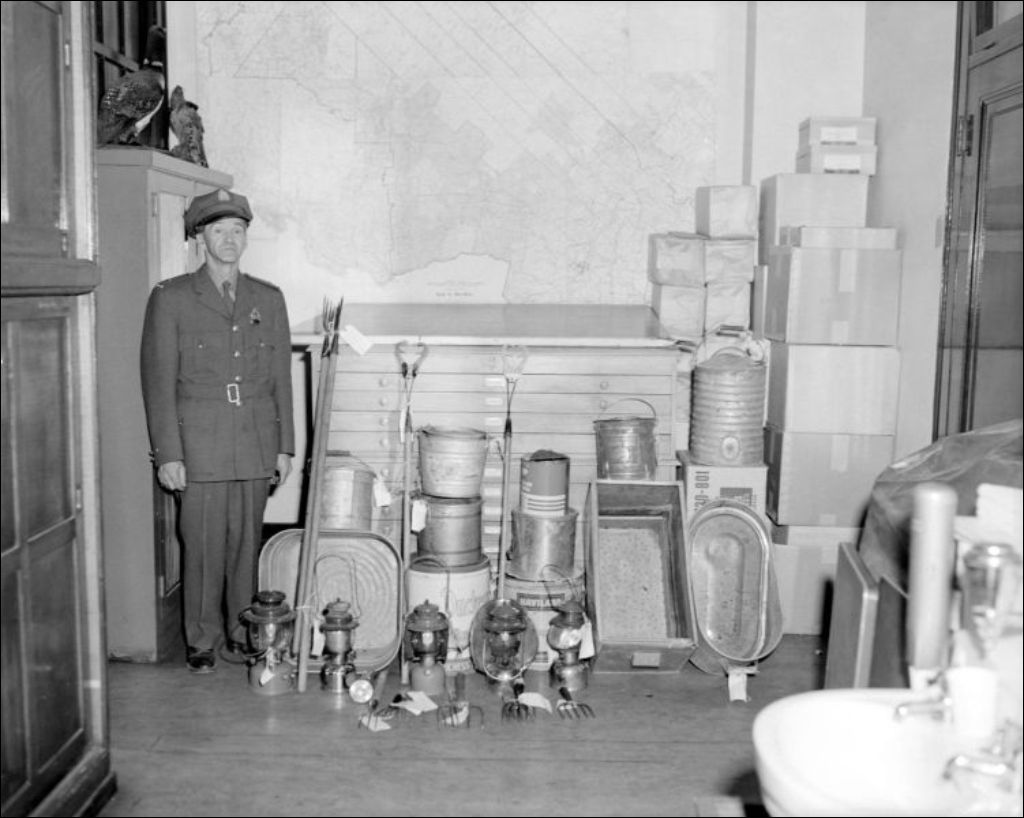 Parmi le matériel saisi, nous retrouvons des lampes-tempête, des fourches et des seaux. Événement photographié pour F. Bourque, directeur du ministère de la Chasse et de la Pêche