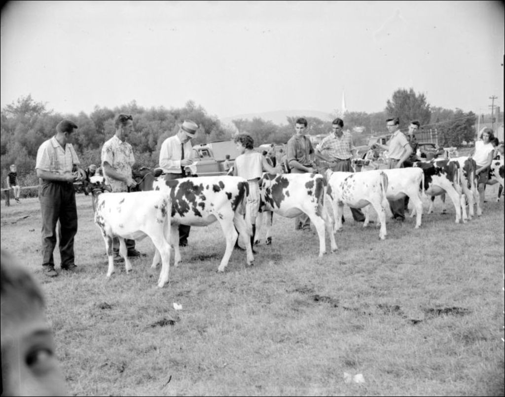 Exposition de chevaux et de taureaux pendant laquelle se déroule une remise de prix. On aperçoit aussi des étalages de conserves et de légumes frais. Événement photographié pour Albin Noël, agronome du ministère de l'Agriculture