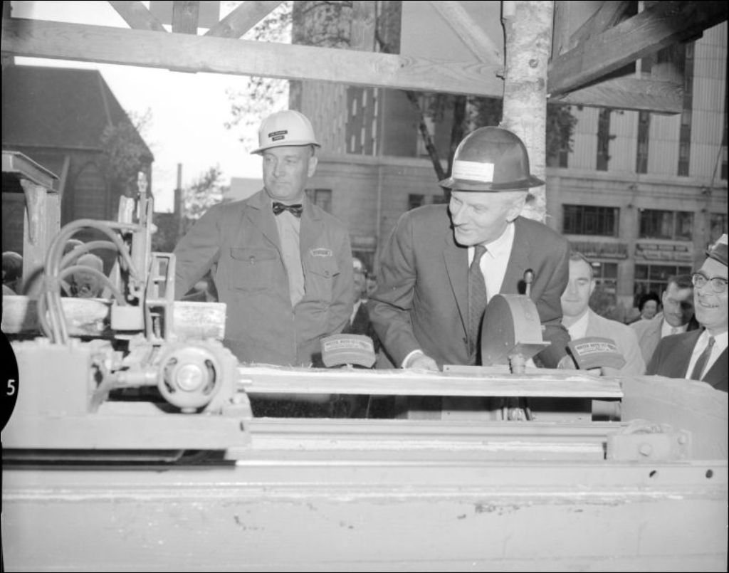 Chez Maxime. Conférencier Bertrand Langlois. Square Dominion, Bona Arseneault. Moulin à scie. Photos - Exposition. École des Arts appliqués. Restaurant Hélène de Champlain, 1961, Archives nationales à Montréal, Fonds Ministère de la Culture et des Communications, (06M,E6,S7,SS1,D611941-611962), Gabor Szilasi.