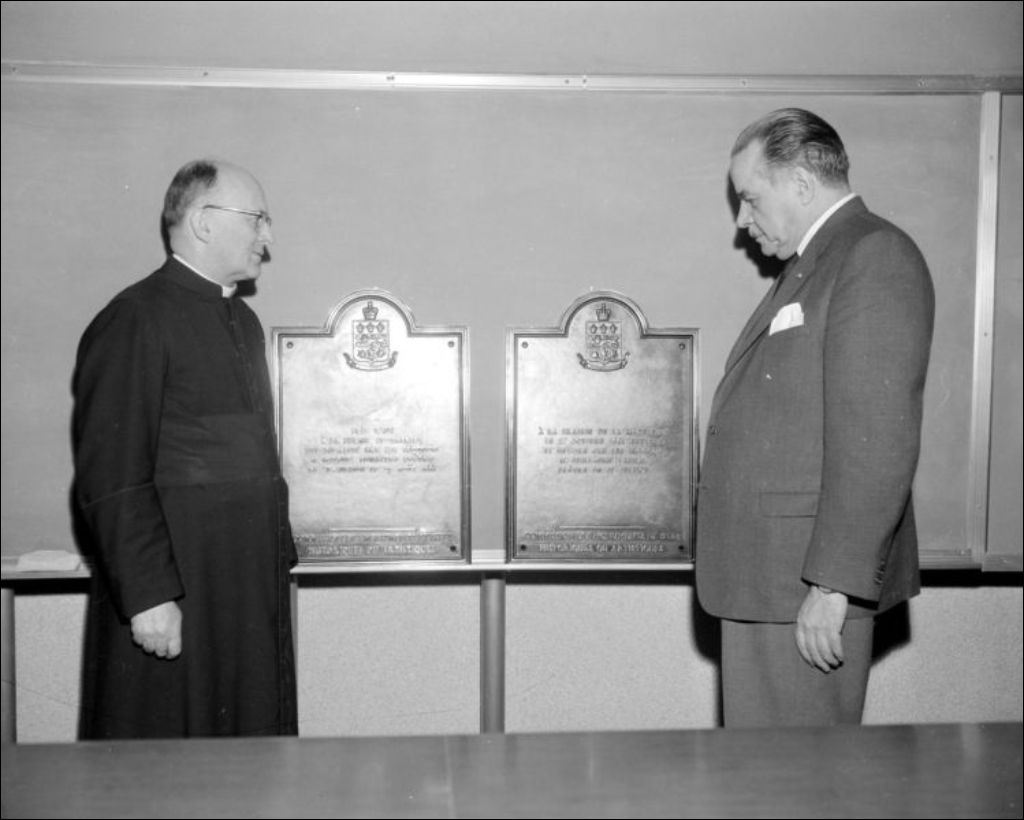 Plaques commémorant les morts héroïques de messieurs Lemaître et Vignal, prêtres de Saint-Sulpice, 1961, Archives nationales à Montréal, Fonds Ministère de la Culture et des Communications, (06M,E6,S7,SS1,D612256-612256), Gabor Szilasi.