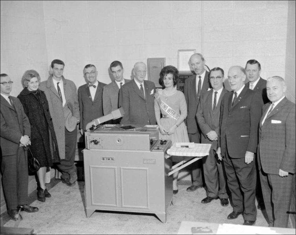 - Visite d'un atelier d'imprimerie en compagnie de Miss Printing Week 1962. Événement photographié pour M. Normandeau, directeur du ministère de la Jeunesse