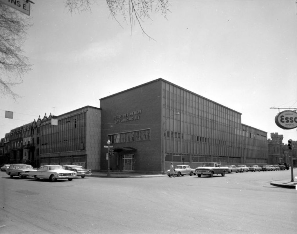 Vue extérieure de l'édifice situé à l'intersection de l'avenue des Pins et Saint-Denis à Montréal. Scène photographiée pour A. Grenier, directeur, École des métiers de l'automobile