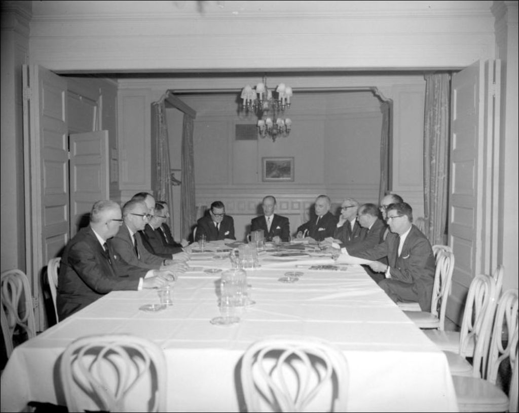 Groupe d'officiers élus, hôtel Queen's de Montréal, 1962, Archives nationales à Montréal, Fonds Ministère de la Culture et des Communications, (06M,E6,S7,SS1,D621218-621218), Adrien Hubert.