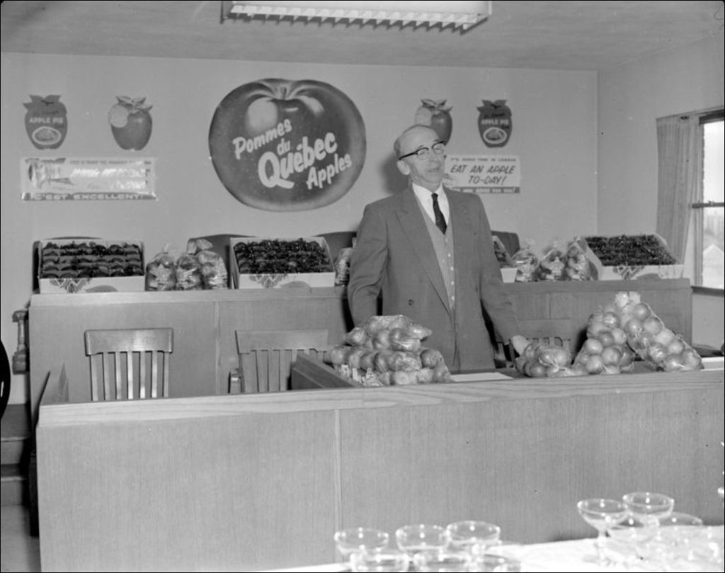 - Réunion devant un étalage de pommes. Événement photographié pour Nolasque April, agronome, président du ministère de l'Agriculture