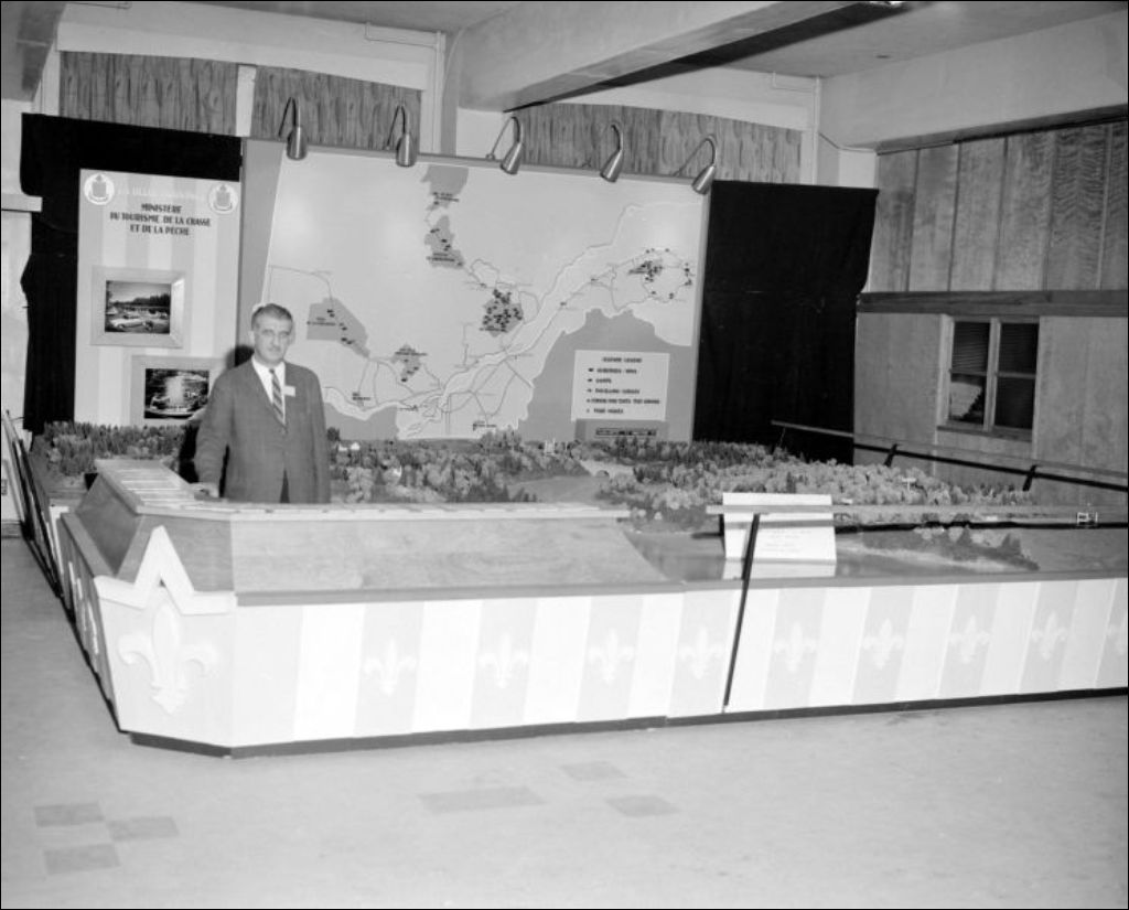 - Nous voyons des détails de kiosques d'exposition présentés au Salon du camping et de la famille. Il s'agit du ministère de la Jeunesse, du ministère des Terres et Forêts et du ministère du Tourisme, de la Chasse et de la Pêche. Rosaire Nadeau du ministère de la Jeunesse a commandé ces photos