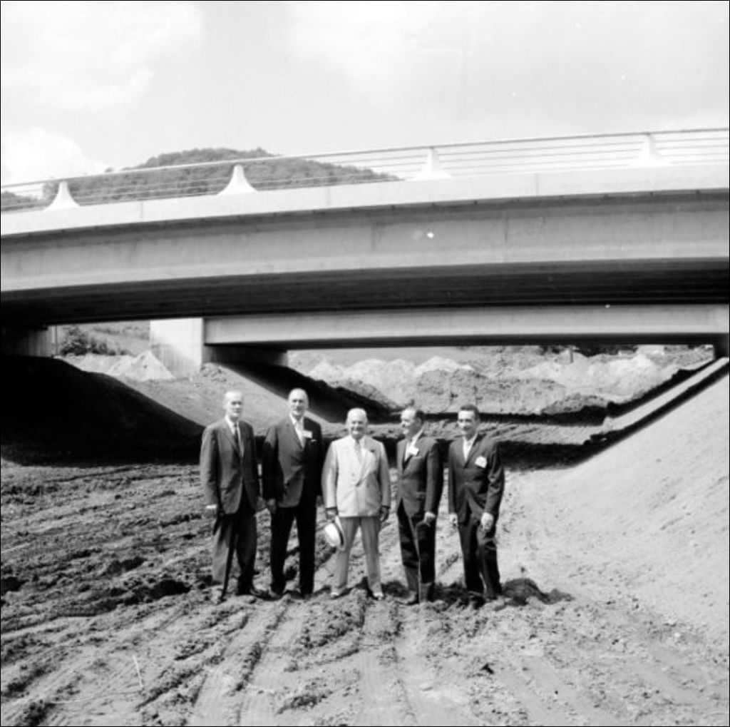 - Travaux sur l'autoroute des Laurentides comprenant la construction du premier poste de péage de Laval-des-Rapides à Laval. Dévoilement d'une maquette lors d'un déjeuner au Mont-Gabriel. La majorité des travaux se déroulent sur un tronçon au nord de Saint-Jérôme. Photographies demandées par Guy Poliquin, président de l'Office de l'autoroute