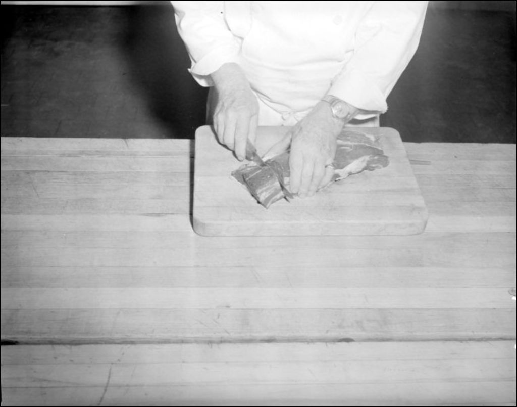 Quelques aspects de la coupe de viande figurent sur les clichés. Ces images prises à l'École des métiers commerciaux ont été commandées par Jules A. Paquin du ministère de l'Éducation