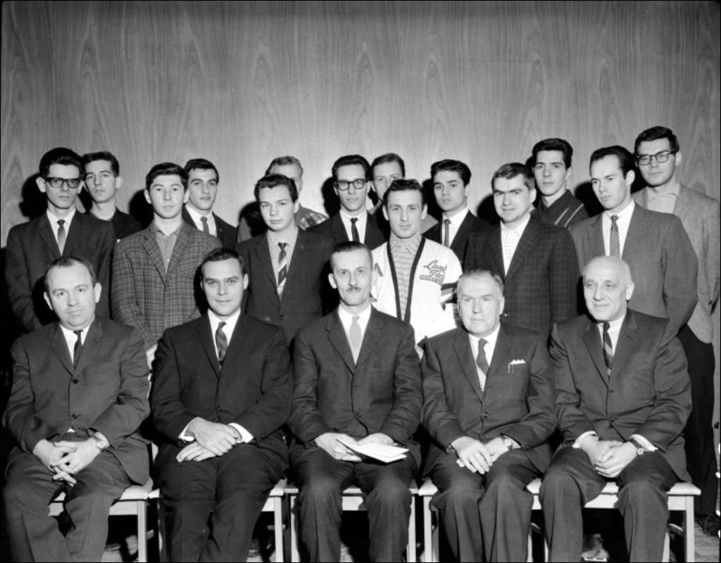 Image prise à l'Institut de technologie Laval (devenu CEGEP Ahuntsic) à la demande de R. C. Dolan du ministère de la Jeunesse. On aperçoit plusieurs donateurs de bourses