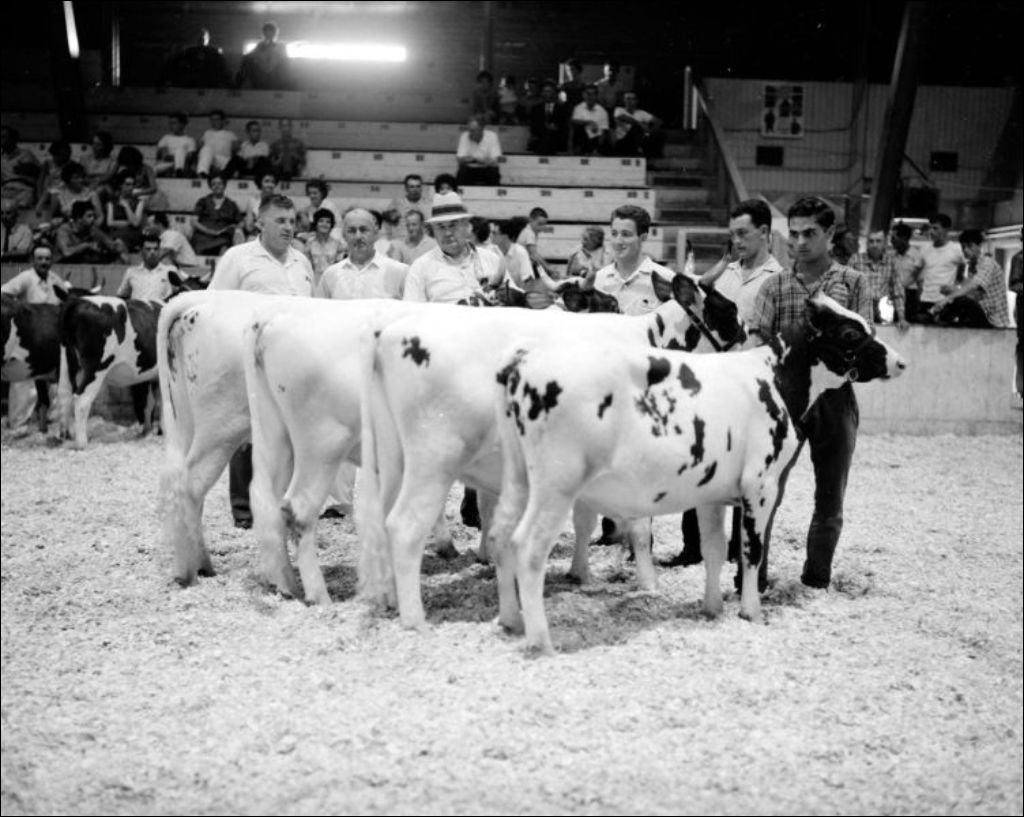 Ces images donnent un aperçu du concours d'élevage Ayrshire et des kiosques d'art domestique montés pour l'occasion. Ces clichés ont été réalisés à l'intention de Bernard Cossette, agronome, pour le ministère de l'Agriculture et de la Colonisation