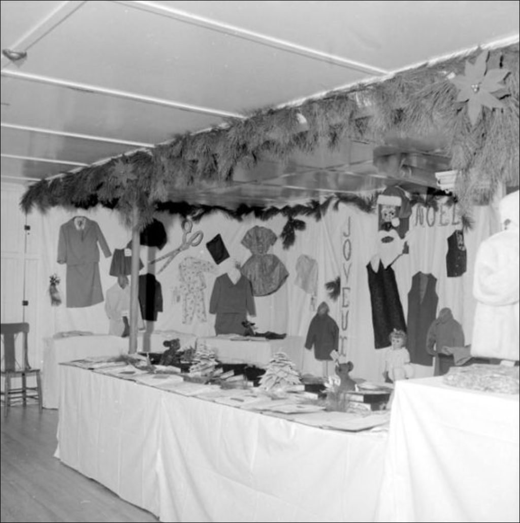 On voit des tables d'exposition et des kiosques préparés en vue de la fête de Noël. Une image montre un groupe d'élèves et de professeurs de l'École ménagère d'Upton. Ces photos ont été commandées par Lucille Morier du ministère de l'Éducation