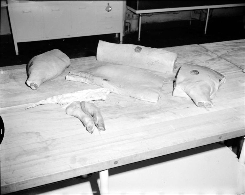 - Dépeçage d'un porc et clichés montrant les morceaux de viande résultant de cette opération. Ces photos ont été prises à l'intention de Jules A. Paquin du ministère de l'Éducation