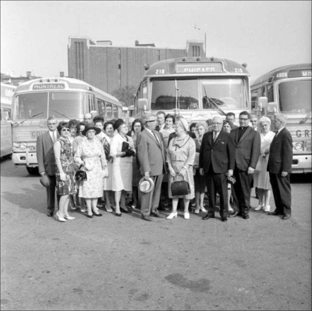 Cette photographie montre un groupe de familles terriennes devant des autobus du terminus de Montréal. Paul Boucher du ministère de l'Agriculture et de la Colonisation a demandé ce cliché