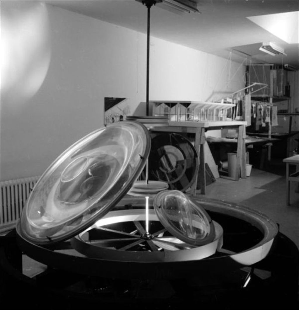 - Groupe réuni autour d'une table à dessin. L'atelier est situé sur la rue Saint-Denis à Montréal. Claude Haeffely du ministère des Affaires culturelles a commandé ces clichés