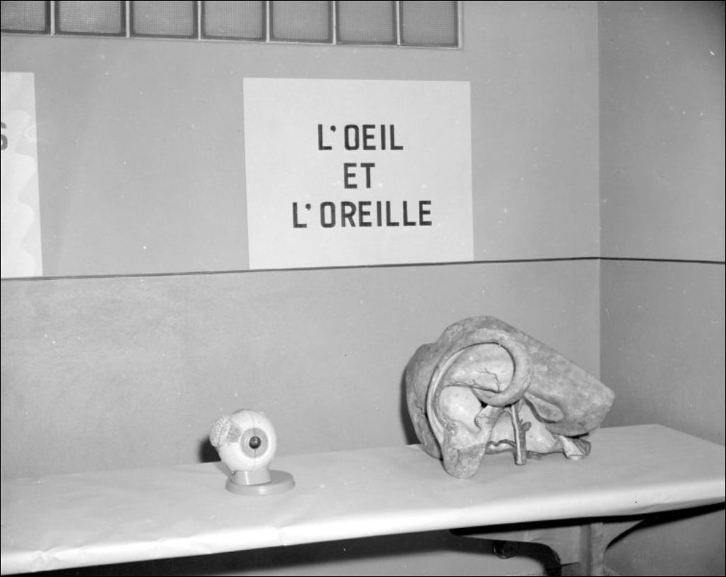 - On voit des tables et des panneaux explicatifs sur l'exposition ayant pour thèmes la biologie des animaux, les insectes et les plantes. Les images montrent également des médecins pratiquant une opération et la bibliothèque de l'École de médecine vétérinaire. Ces photos ont été faites à la demande de J.-G. Lafortune, docteur en médecine vétérinaire, pour le ministère de l'Agriculture