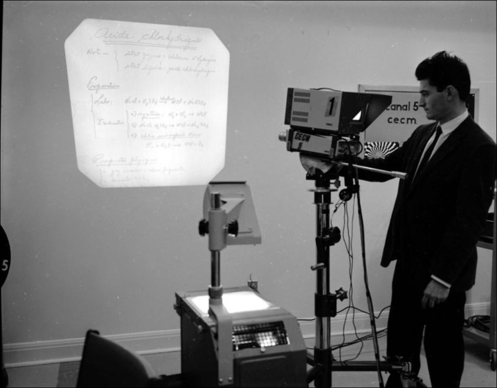 Ces images montrent des studios d'enregistrement et de mixage ainsi que le tournage d'un cours pour la Commission des écoles catholiques de Montréal (CECM) au canal 5. Ces photos ont été faites à la demande de Gilles Guilbault pour le ministère de l'Éducation