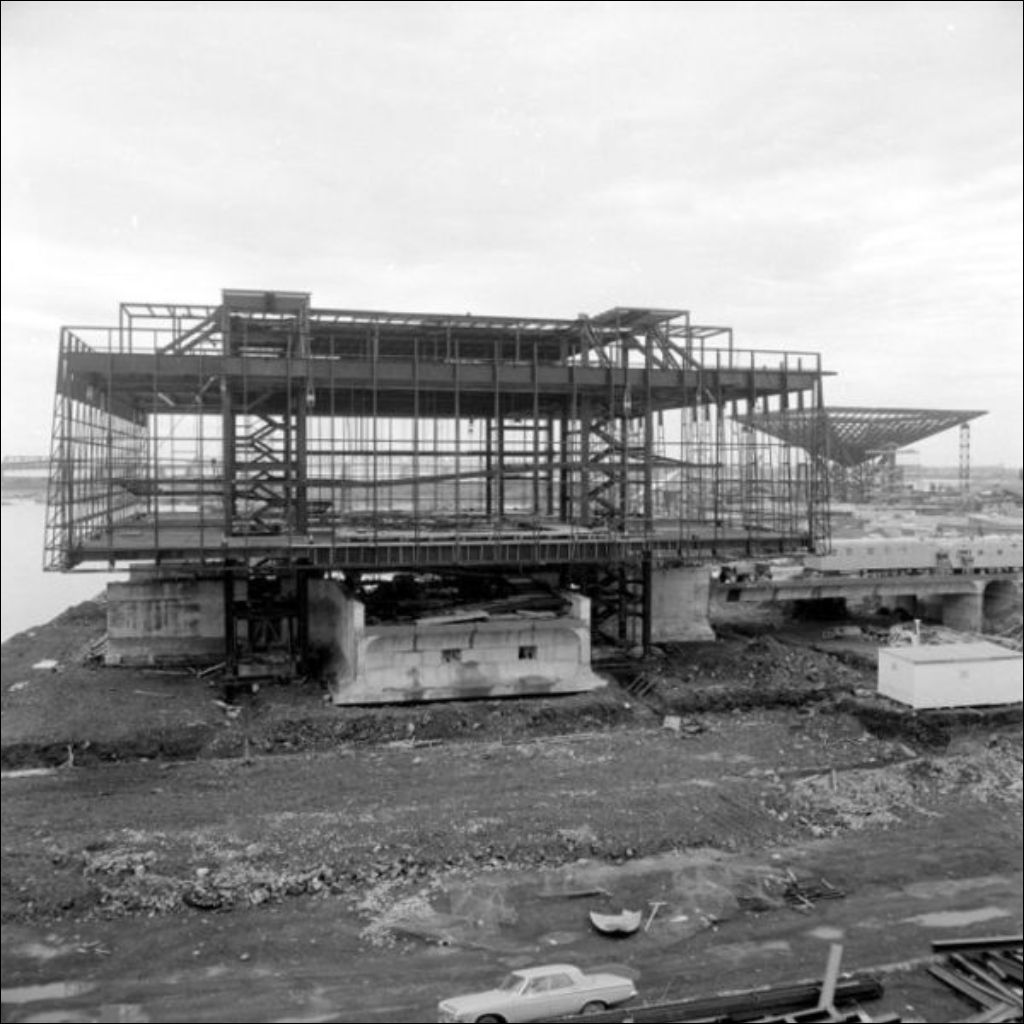 Progression des travaux. Pavillon du Québec. Île-Sainte-Hélène, 1966, Archives nationales à Montréal, Fonds Ministère de la Culture et des Communications, (06M,E6,S7,SS1,D661040-661040), Gabor Szilasi.