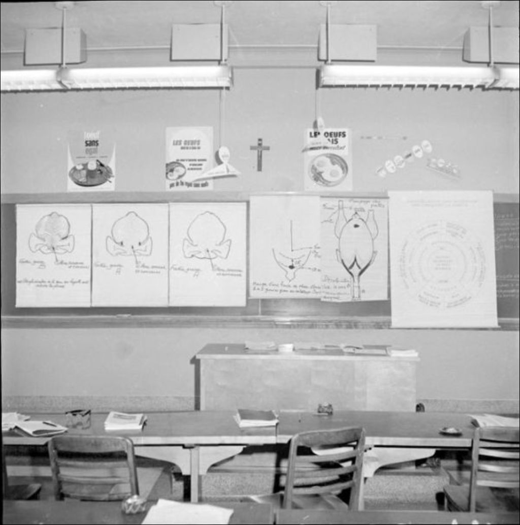 On remarque les illustrations du cours sur les murs d'une classe et un atelier de pratique. Ces images ont été faites à l'intention du docteur J.-G. Lafortune pour le ministère de l'Agriculture