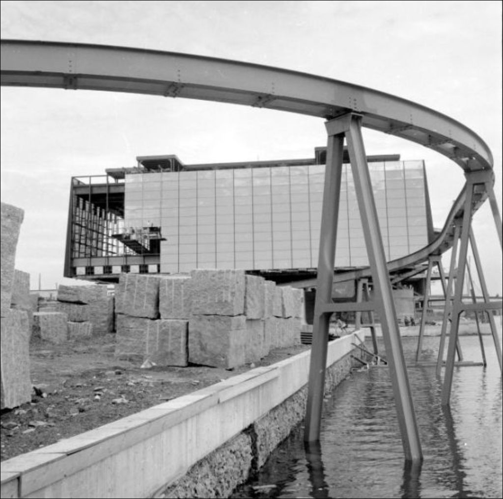Progression des travaux. Pavillon du Québec. Île-Sainte-Hélène, 1966, Archives nationales à Montréal, Fonds Ministère de la Culture et des Communications, (06M,E6,S7,SS1,D661663-661663), Gabor Szilasi.