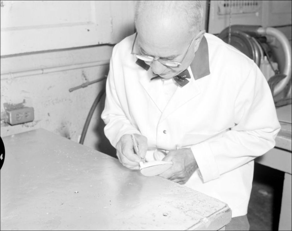 - Les images illustrent diverses opérations (à la machine ou manuelle) de la fabrication des chaussures en série. On voit les étapes du collage, de la couture et de la coupe. Ces images ont été prises à l'intention de J. P. Malo pour le ministère du Travail