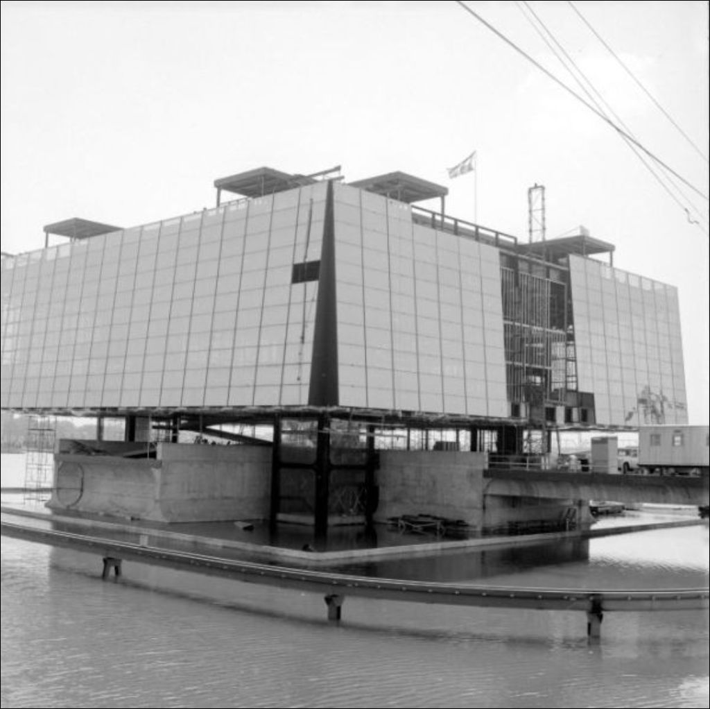 Progression des travaux. Pavillon du Québec. Île-Sainte-Hélène, 1966, Archives nationales à Montréal, Fonds Ministère de la Culture et des Communications, (06M,E6,S7,SS1,D661749-661751), Adrien Hubert.