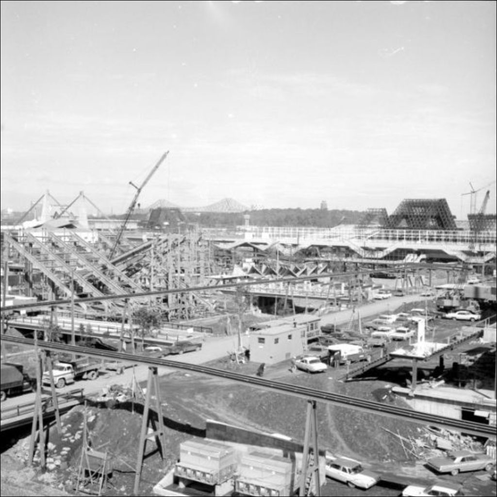 Progrès des travaux sur le chantier de l'Exposition universelle de 1967 à Montréal, 1966, Archives nationales à Montréal, Fonds Ministère de la Culture et des Communications, (06M,E6,S7,SS1,D661885-661893), Gabor Szilasi.