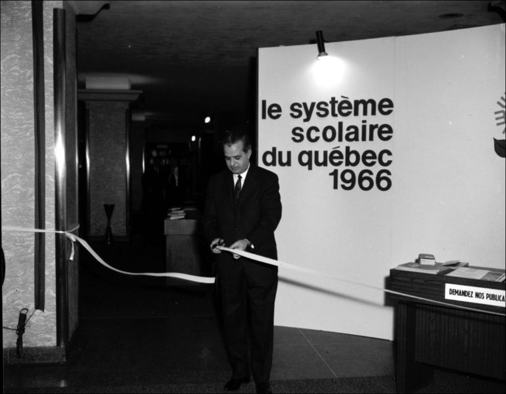 Jean-Jacques Bertrand, ministre de l'Éducation inaugure le kiosque Le système scolaire du Québec 1966. Ce dossier a été réalisé à la demande de Jacques Derome pour le ministère de l'Éducation