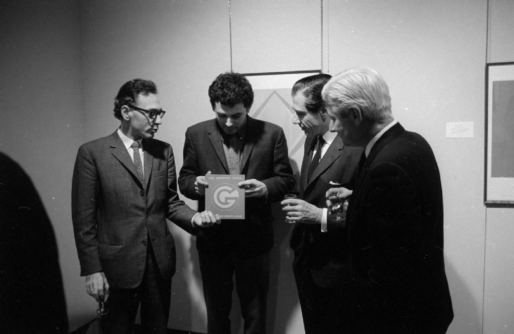 - Les invités et l'artiste sont réunis pour le vernissage. On remarque également les oeuvres. Dossier réalisé pour Henri Barras du ministère des Affaires culturelles