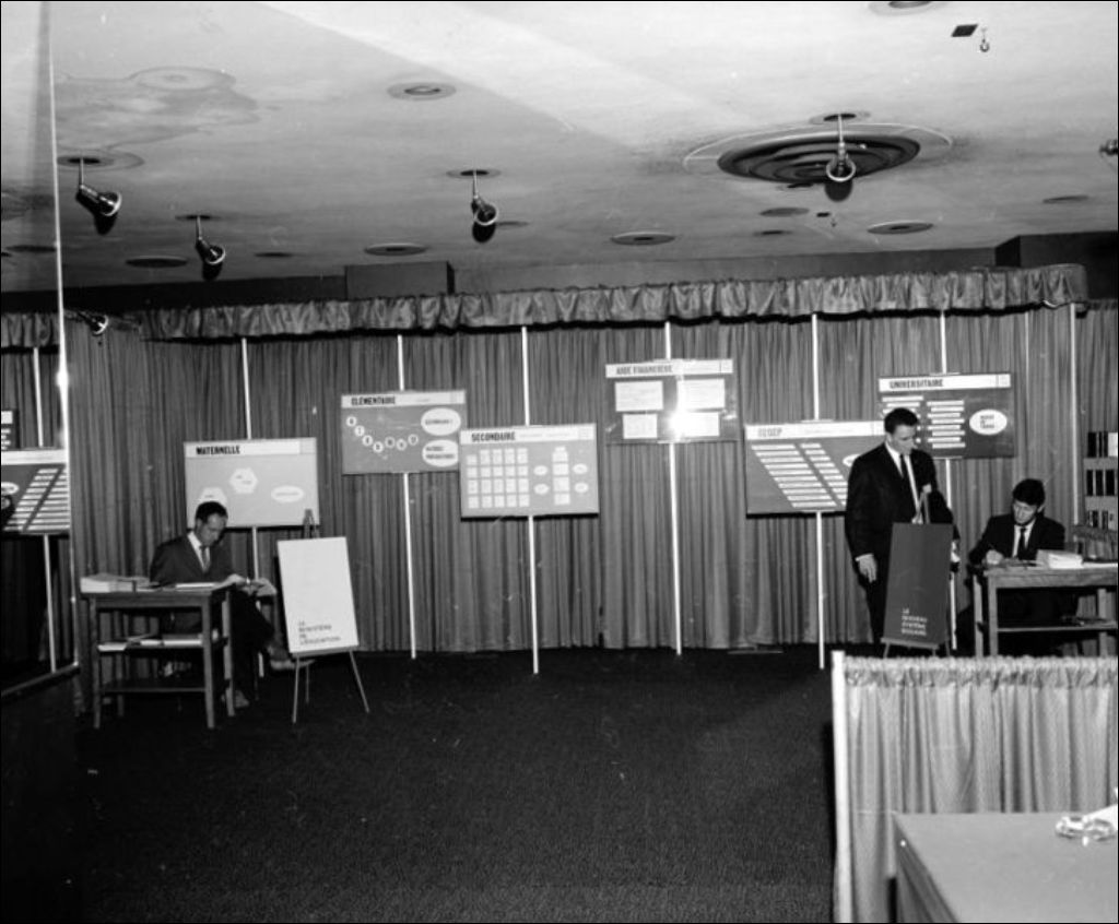 L'hôtel Reine Elizabeth de Montréal présente le kiosque du ministère de l'Éducation où des informations sont données sur le nouveau système scolaire, de la maternelle à l'université. Le cliché a été demandé par R. Nadeau du ministère de l'Éducation