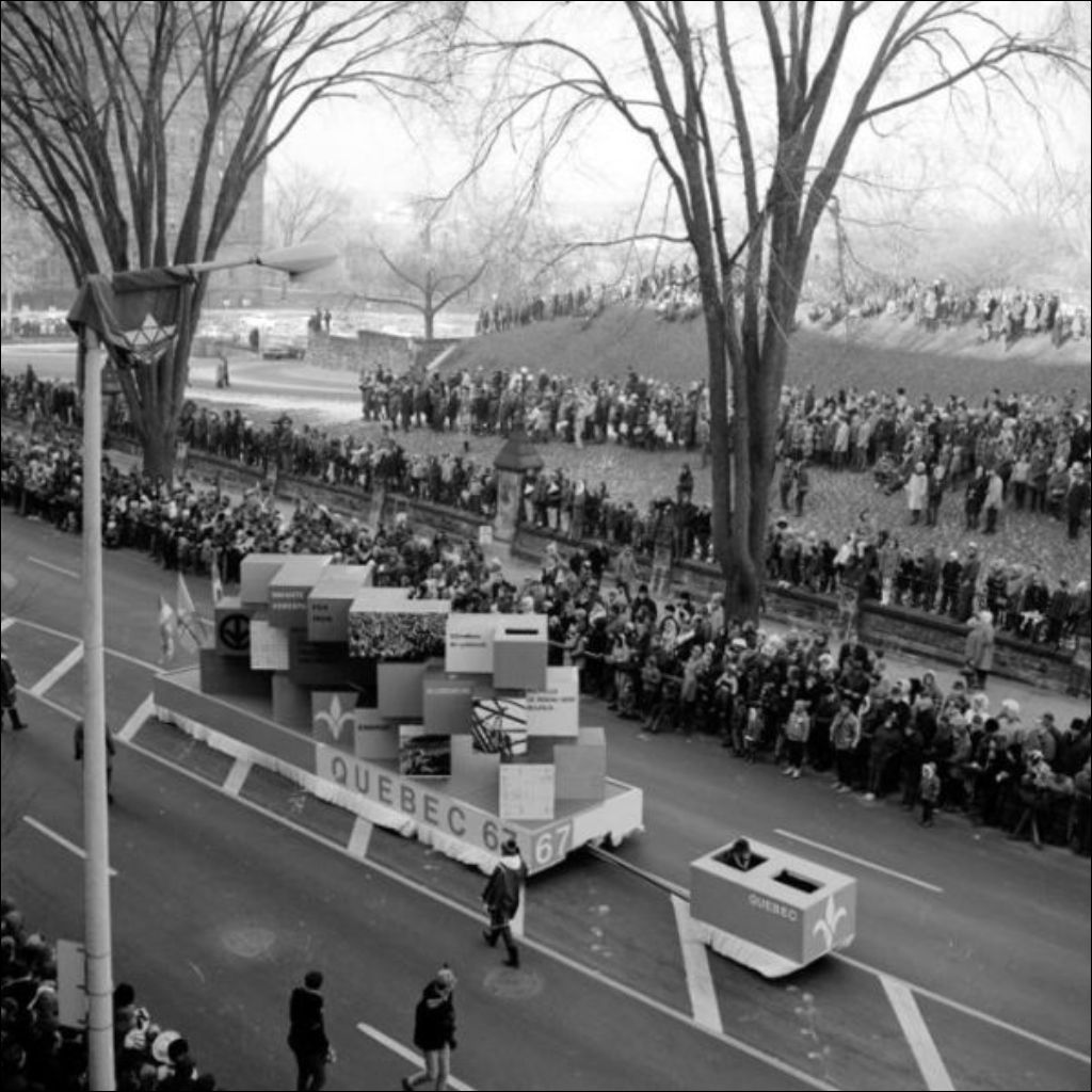 Char allégorique du Québec figurant dans la parade de la Coupe Grey à Ottawa, 1967, Archives nationales à Montréal, Fonds Ministère de la Culture et des Communications, (06M,E6,S7,SS1,D672968-672984), Gabor Szilasi.
