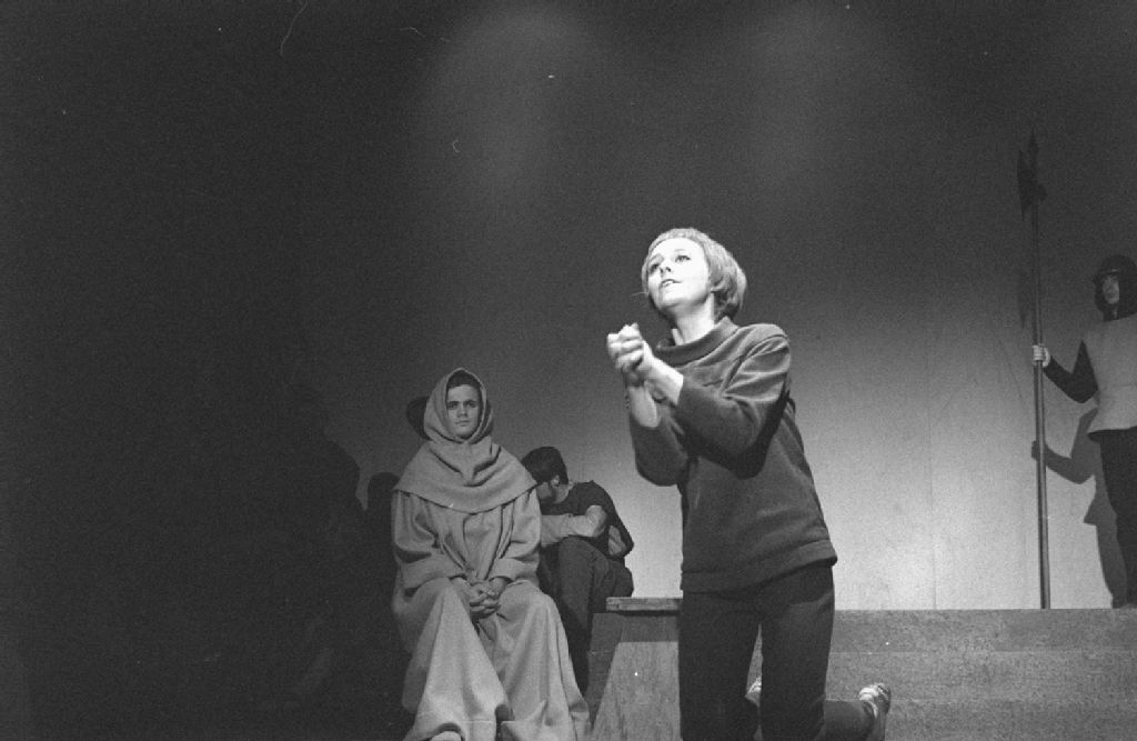 - Comédiens réunis sur la scène. Dossier produit pour J. Valcourt du ministère des Affaires culturelles