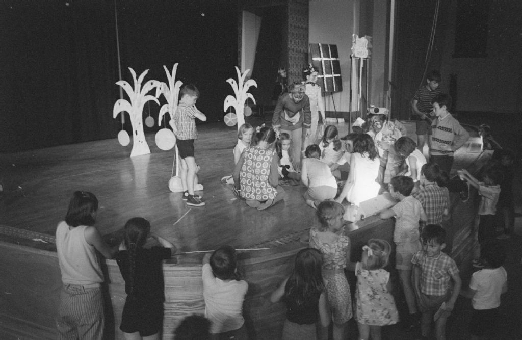 - On remarque les comédiens costumés sur la scène et les enfants qui assistent et participent à la représentation. Dossier demandé par Claude Haeffely du ministère des Affaires culturelles, Bibliothèque nationale du Québec