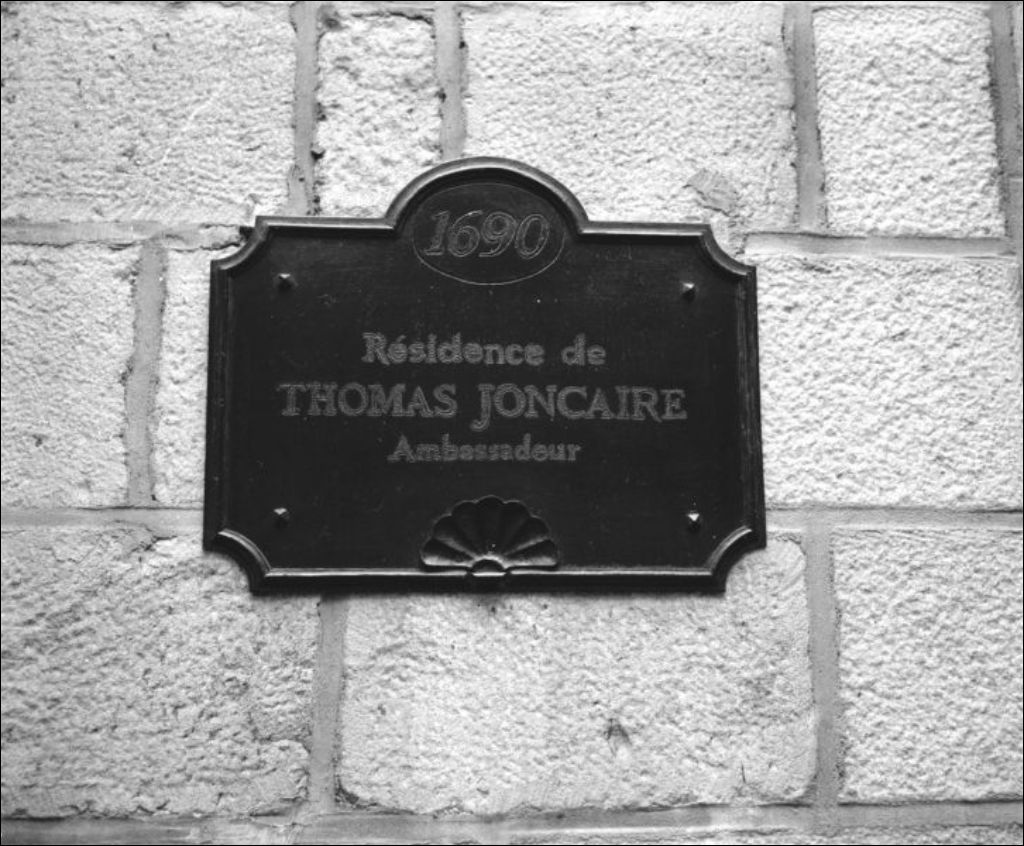L'écriteau identifie la résidence de l'ambassadeur Thomas Joncaire en 1690. Il est situé à l'angle des rues Saint-Paul et Saint-Laurent. Cliché commandé par T. Gareau du ministère des Affaires culturelles