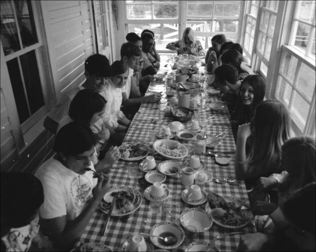 - Le groupe de jeunes Louisianais est en visite à l'Auberge du Petit Bonheur de Sainte-Agathe. Nous voyons les jeunes pendant une randonnée équestre et partageant un repas. Clichés commandés par M. Vergnes du ministère des Affaires culturelles, Office du film du Québec