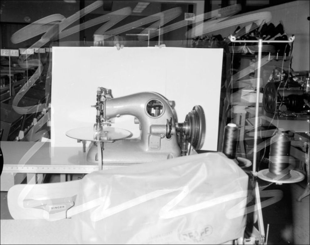 Machine à coudre conçue pour la cordonnerie probablement photographié à la Commission d'apprentissage de l'industrie de la chaussure. Cliché commandé par Luc Gauthier du ministère de l'Éducation, Centre d'apprentissage de la chaussure