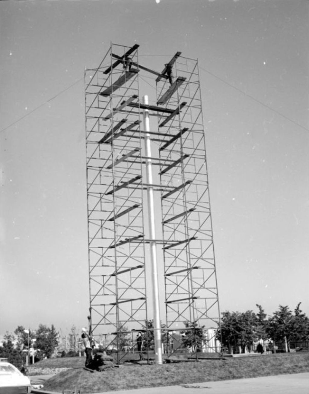- Étapes du montage d'une sculpture à l'extérieur du musée d'Art contemporain à Montréal. Nous voyons les différentes pièces ainsi que leur mise en place. Clichés commandés par Henri Barras du ministère des Affaires culturelles, musée d'Art contemporain