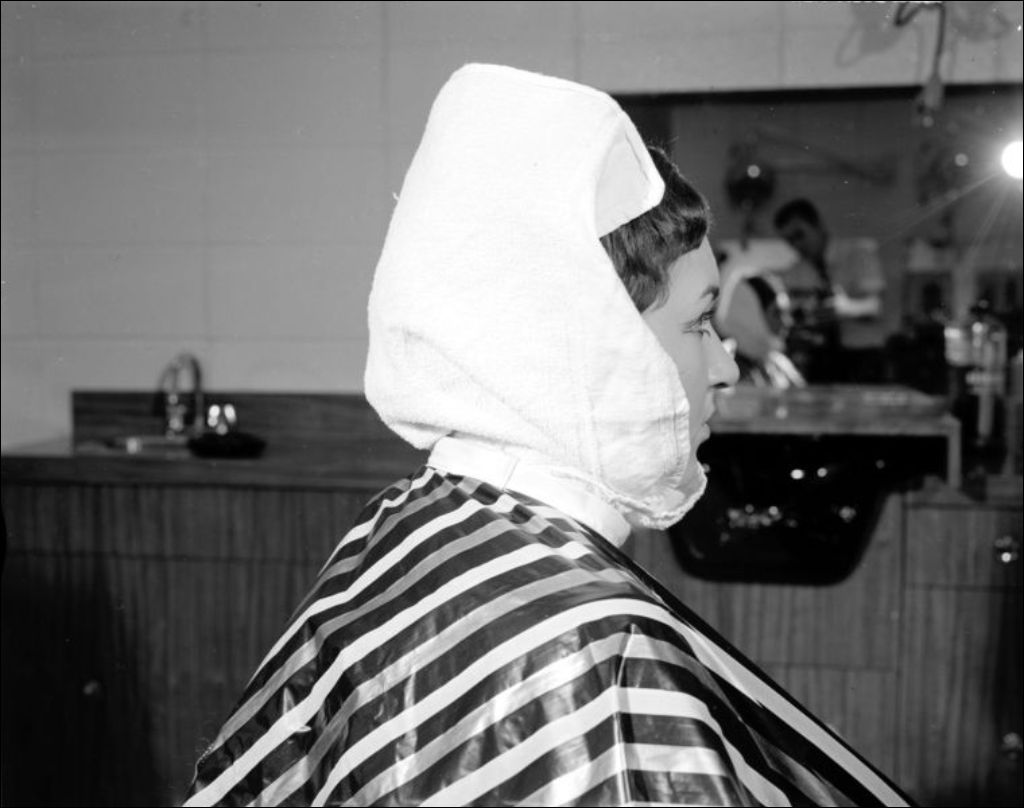 - Un coiffeur lave, sèche et peigne les cheveux d'une cliente dans un salon situé sur la rue Parthenais à Montréal. Clichés commandés par G. Fleury du ministère du Travail, Service de l'audio-visuel