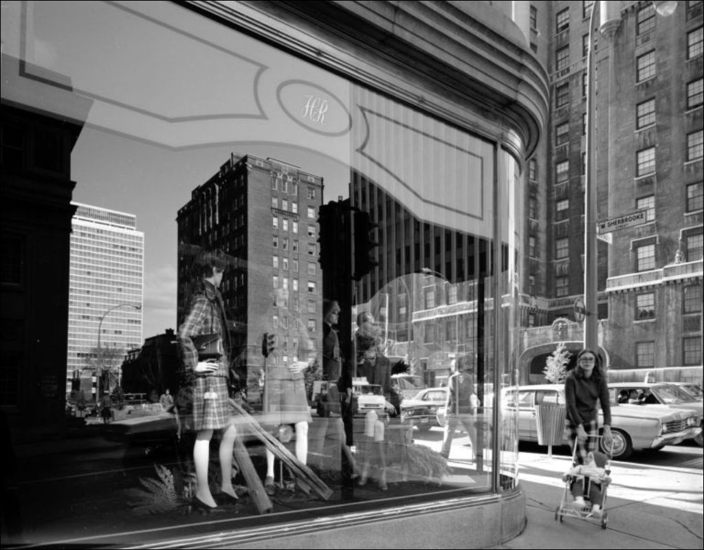 - Photographies du centre-ville de Montréal. Nous apercevons le Forum, les édifices du centre-ville, la vitrine de la boutique HR (coin Sherbrooke et de la Montagne) ainsi que des artères commerciales avec boutiques, bars, restaurants et cafés. Clichés commandés par Paul Girard, ministère des Affaires culturelles, Office du film du Québec