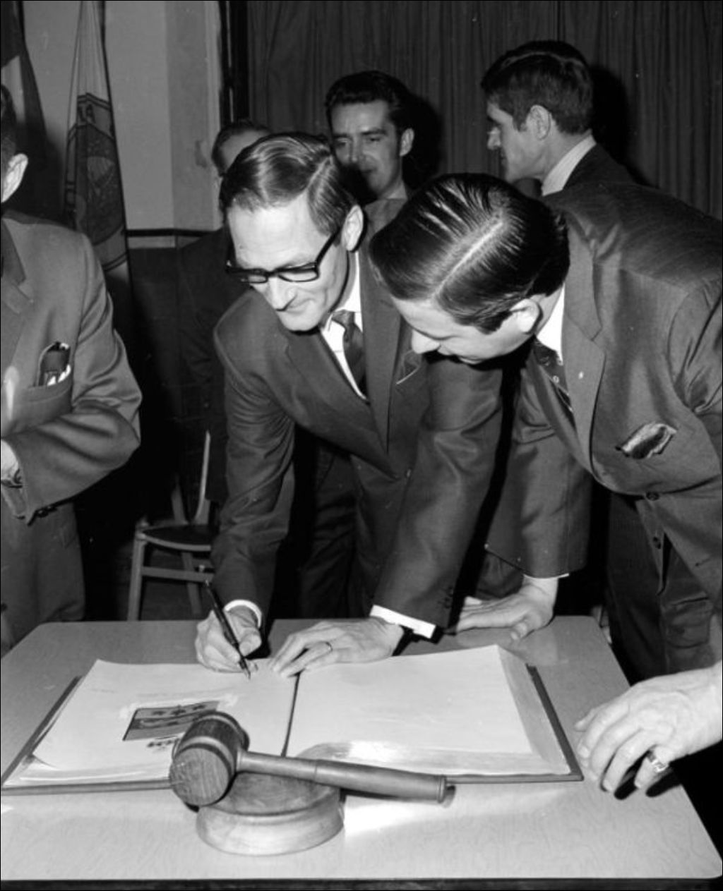 - Nous voyons les responsables prononcer des discours, couper le ruban, dévoiler une maquette et signer le registre des invités. Il faut mentionner la présence de Fernand Lizotte, ministre des Transports et des Communications. Clichés commandés par Claude Bernard, ministère de la Voirie, Service de l'information