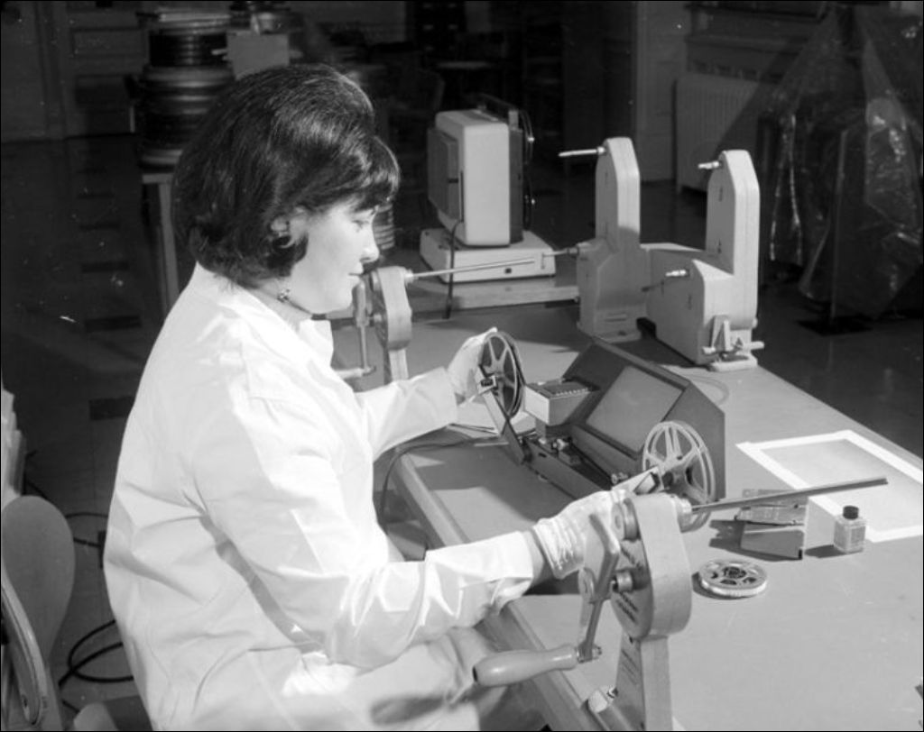 Les deux images montrent une technicienne se servant d'un projecteur. Ces clichés ont été faits pour J. Parent du ministère des Affaires culturelles