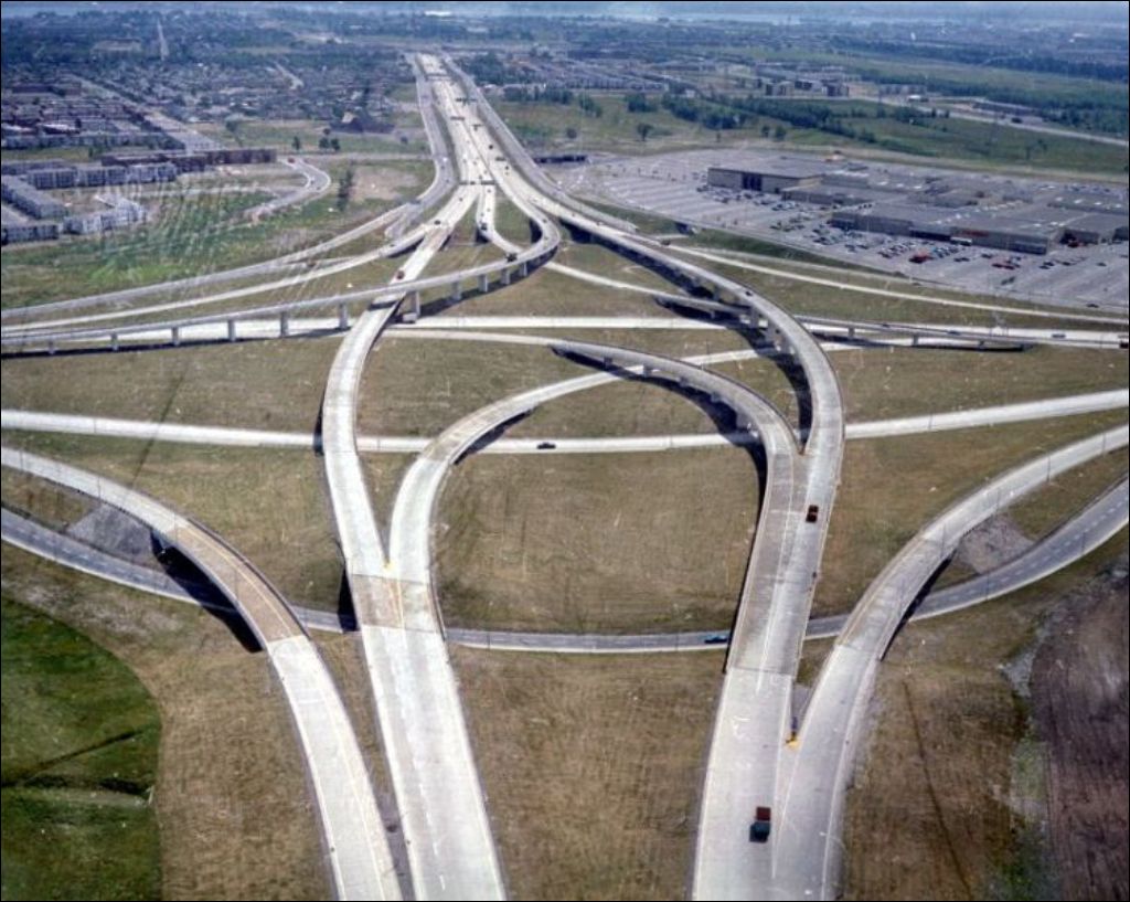 Échangeur près des Galeries d'Anjou, 1970, Archives nationales à Montréal, Fonds Ministère de la Culture et des Communications, (06M,E6,S7,SS1,D700453-1-700458-1), Gabor Szilasi et Gilles Langevin.