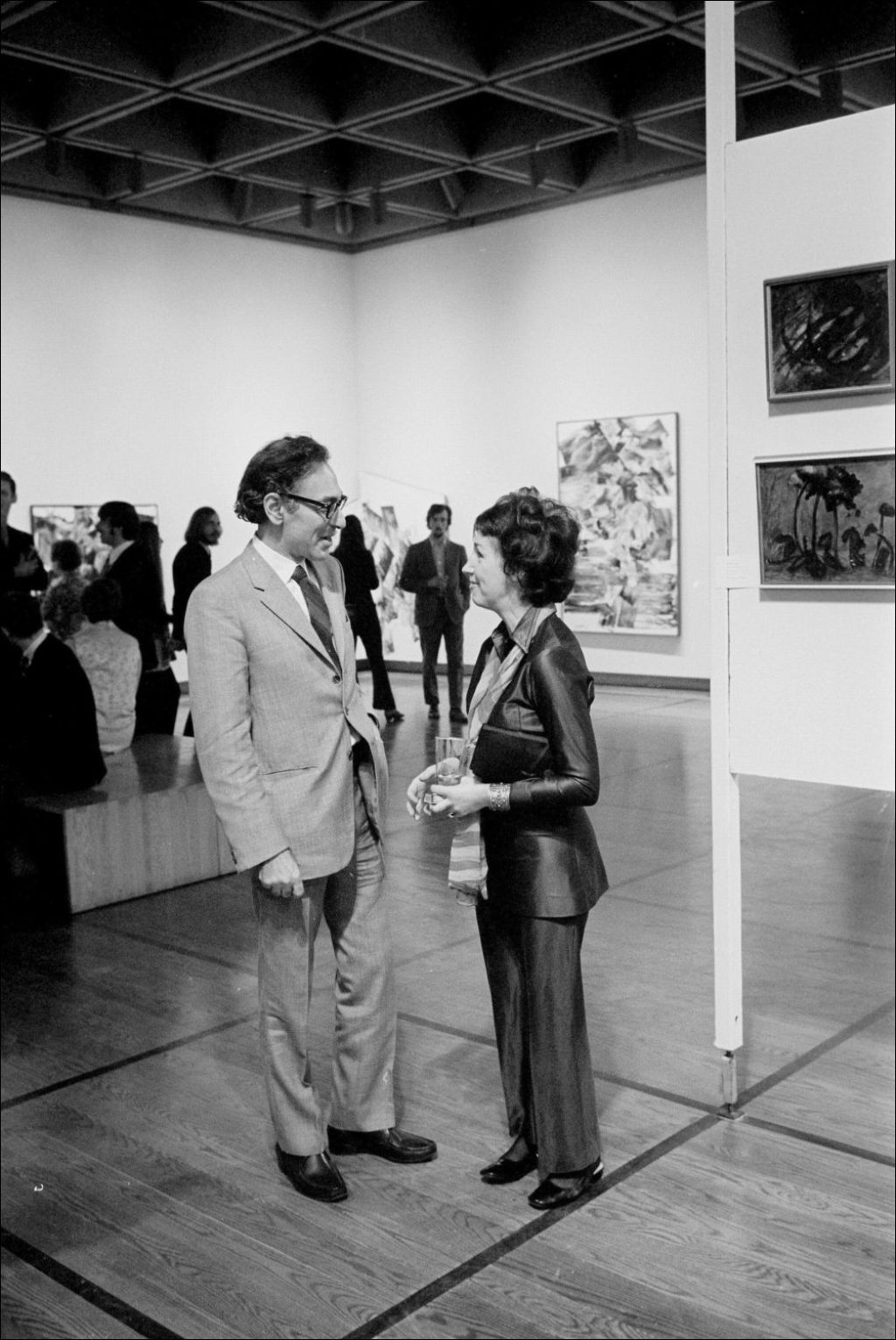 - L'exposition s'intitule Marcelle Ferron de 1945 à 1970. On remarque l'artiste peintre, les invités au vernissage et les oeuvres exposées. Clichés demandés par Henri Barras du ministère des Affaires culturelles, musée d'Art contemporain