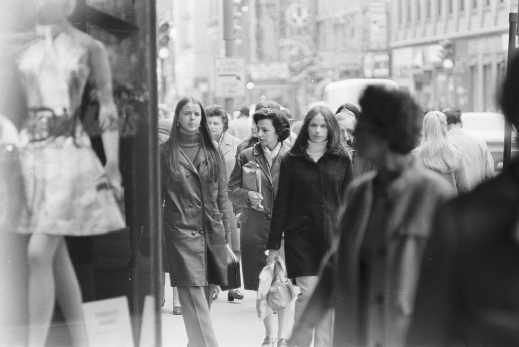 - À l'heure de pointe, on remarque des piétons et un handicapé en chaise roulante en train de quêter. Clichés commandés par Paul Girard du ministère des Affaires culturelles, Office du film du Québec