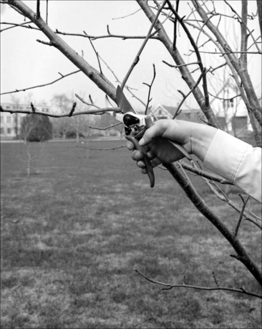 - Opérations horticoles : protection de la base d'un arbre et taille chez W. H. Perron, commerce spécialisé en horticulture. M. Lasnier a commandé ces images pour le ministère de l'Agriculture